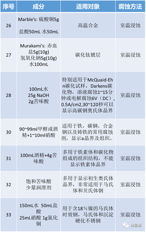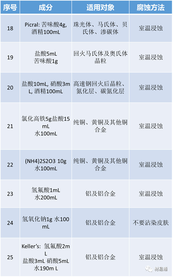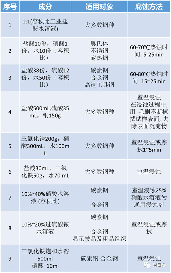 在與金屬有關的實驗過程中,往往不可避免的要用到金相試樣制備技術,而其中最為關鍵的是針對一定的材料選擇合適的侵蝕劑及侵蝕方法,只有這樣才能制好我們需要的金相試樣。這里,我們就將常見的侵蝕劑及其適用對象與方法簡單羅列如下。