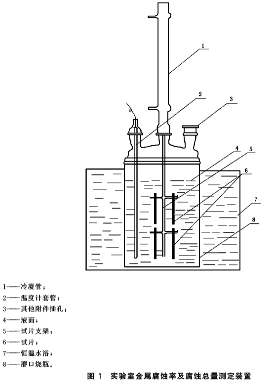 試驗方法概要:將準備好并經過準確稱量的金屬試片全浸在試液中,在一定溫度和規定時間的條件下進行腐蝕試驗,待試驗完畢后,取出試片經處理后再稱重、通過試片的質量損失來計算試液對試片金屬的腐蝕率及腐蝕總量,以此來評價工業設備在化學清洗過程中的腐蝕率和腐蝕總量。