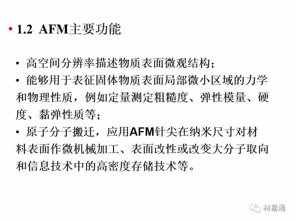AFM廣泛應用于材料科學中,是一種非常重要的表面表征技術。除了進行形貌觀察,AFM還可以用來測量物質和材料表面原子間的作用力、表面彈性、塑性、硬度、粘著力、摩擦力等性質。